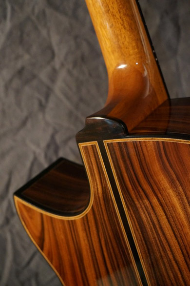 et filets érable. Le manche en acajou avec une touche ébène est magnifiquement mis en valeur par un placage de tête en palissandre de santos. Pas de repères sur la touche, juste les indispensables points de nacre sur le bord de celle-ci. L'absence de matière sur la touche apporte à l'ensemble de l'instrument une cohérence subtile dans la sobriété, très esthétique.
