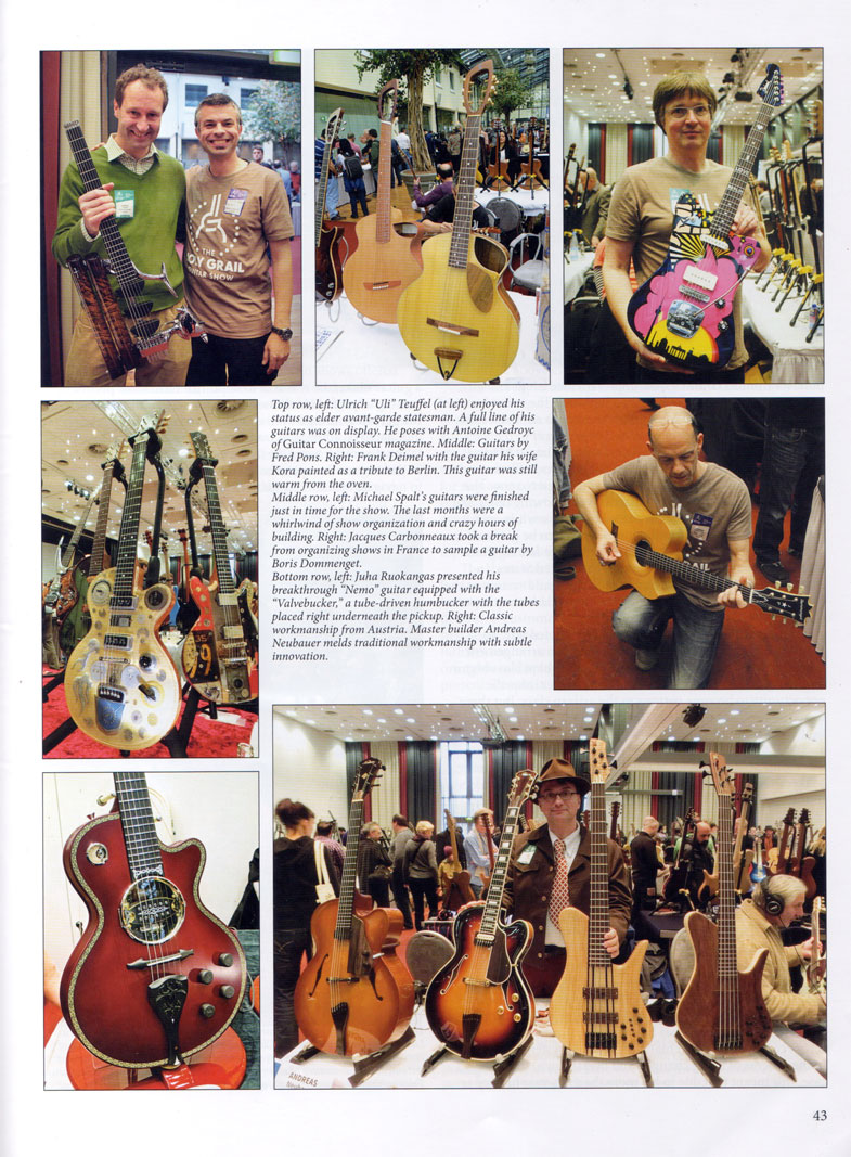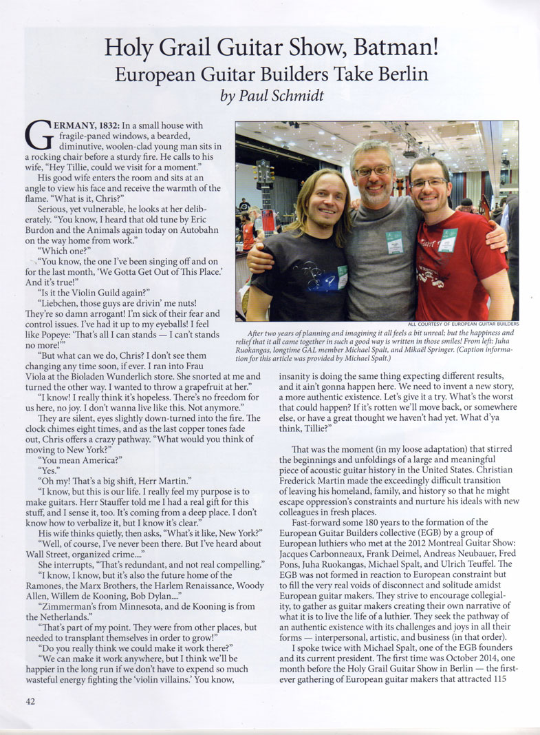 Quelle ne fut pas ma surprise de voir, le 6 juin dernier, sur la page Facebook de "The Holy Grail Guitar Show" les deux premières pages d'un article de neuf pages qui lui était consacré et paru dans la très honorable revue US "American Lutherie" de la mythique Guild of American Luthiers.