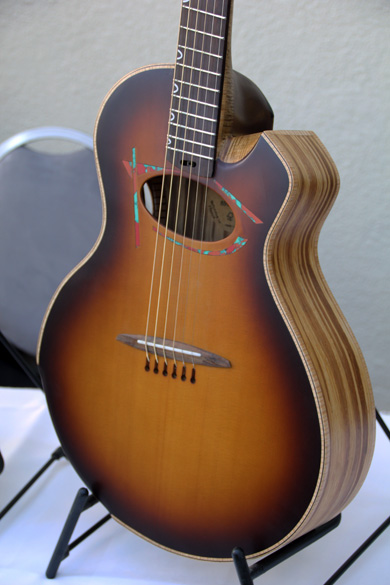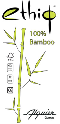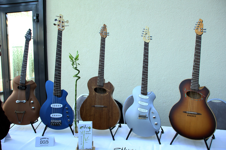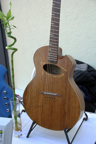 avec un concept révolutionnaire présenté à l'occasion de cette deuxième édition, sur 5 modèles. A première vue, ces instruments ne surprennent pas le regard de ceux qui connaissent le design de Jean-Yves. Cependant, son concept est une petite révolution puisque 4 des 5 modèles sont réalisé à 100% , non pas en bois, mais à base d'une plante : le bambou ! Table, caisse, manche, touche, chevalet sont en bambou !