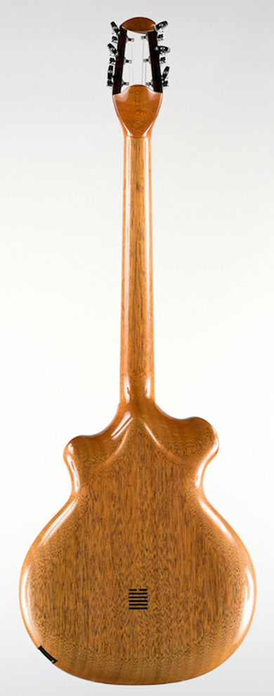 mot du luthier : "La guitare acoustique à caisse ronde que j'ai développée au fil des ans fait référence à mon étude des instruments à caisse ronde orientaux, qui sont en fait à l'origine de la lutherie moderne et de la guitare folk. L'idée d'allier certaines qualités du Oud à la guitare acoustique est partie prenante de ma démarche artistique depuis 2006. De la création( Rolf, Cluster ) à la série (Guitares-fruit) au prototypes ( Po), je me suis familiarisé avec l'aspect bombé et trois-dimention dans ma pratique. Ces expériences m'ont menées vers un apprentissage et le développement d'un savoir-faire, et au final l'obtention d'une bourse de recherche et création du Conseil des Arts et des Lettres du Québec pour concevoir ma première guitare à caisse ronde, soit Oudtar en 2009.