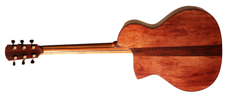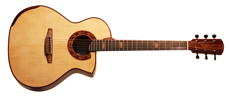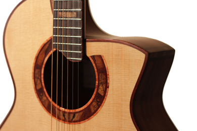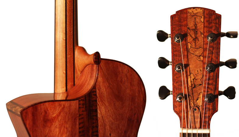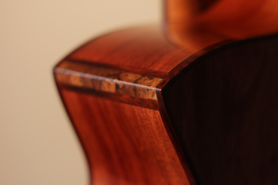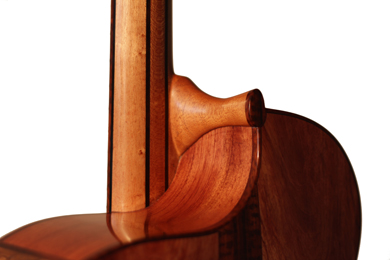 qui ont été utilisées ici : épicéa, cèdre rouge, bubinga, amourette, acajou, palissandre indien, padouk et palissandre de Madagascar. Le travail de plaquage et de fileterie est sublime mais ce que l'on remarque le plus c'est ce pan coupé au talon decalé (voir photos ci-dessous) qui est une innovation du luthier. En décalant le talon, il a cherché à liberer le manche pour permettre un meilleur accès aux aigus privilégiant le jeu au delà de la 12eme case.