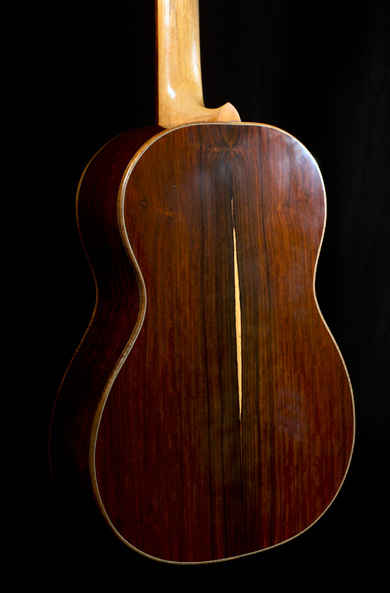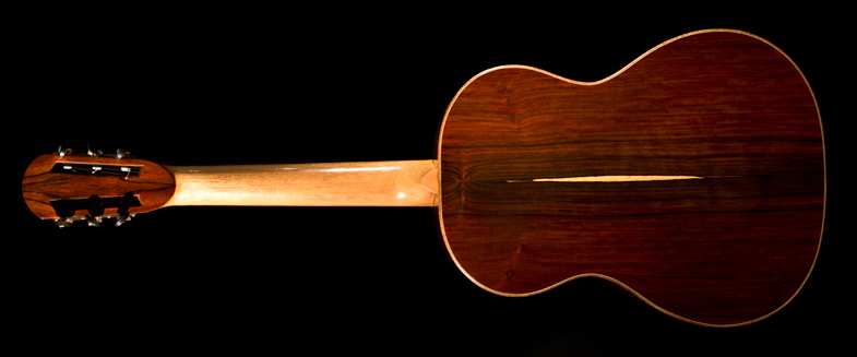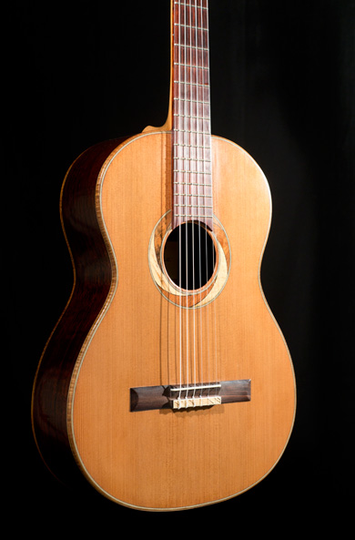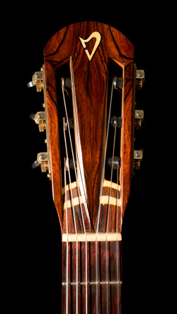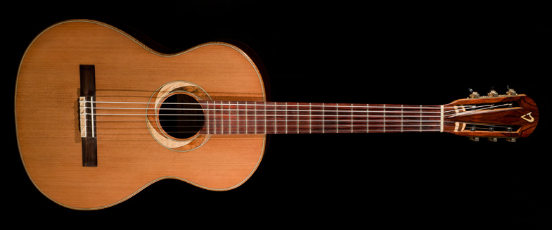 Il nous présente ici son modèle de concert avec une table en cèdre et un dos et des éclisses en Cocobolo. Beau travail de finition avec une tête particulièrement réussie.