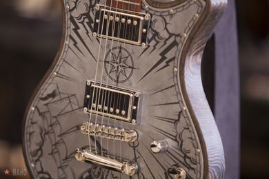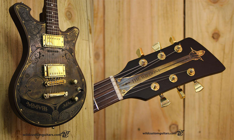 "L'équipe de Wild Customs à mis en oeuvre tout son goût et son savoir-faire pour créer un instrument d'exception. Une guitare 7 cordes créée à partir d'une seule pièce de frène ondé. Une touche en érable flammé traverse la guitare du sillet jusqu'à l'extremité inférieure du corps pour obtenir un transfert de vibrations hors du commun. Les cordes traversantes complètent le tout. Un double trussrod est installé dans le manche pour une stabilité parfaite.