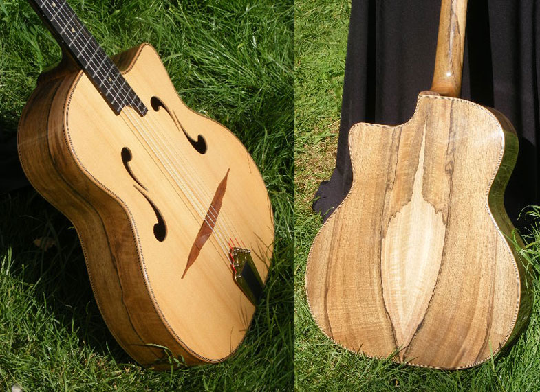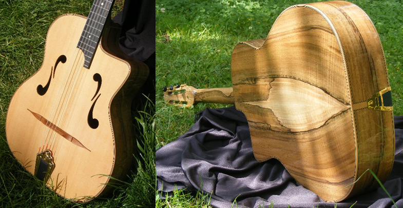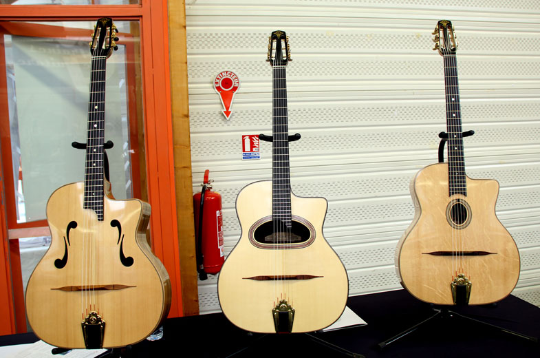 La guitare présentée et jouée par Adrien Janiak est le modèle chorus avec un diapason de 670mn qui arbore deux ouïes doublées sur une table en cèdre. Le dos, les éclisses et le manche sont en noyer et la touche en ébène.