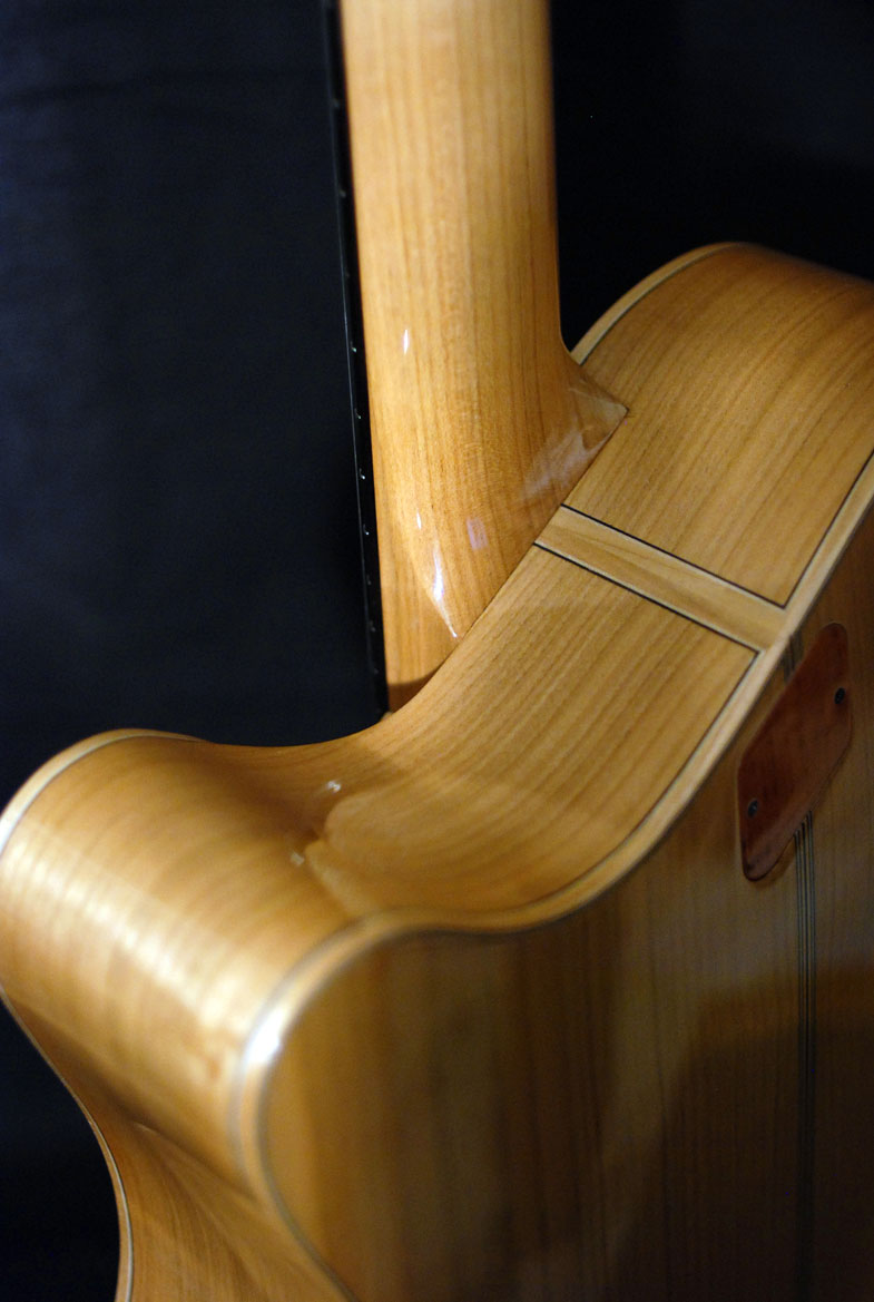Yves utilise régulièrement des fruitiers comme le poirier, le noyer et le cerisier (ou merisier) dans sa production et c'est cette essence qui est utilisée ici pour le dos, les éclisses et le manche. De l'ébène pour la touche et le chevalet. Les filets sont réalisés en ébène, cerisier et érable.