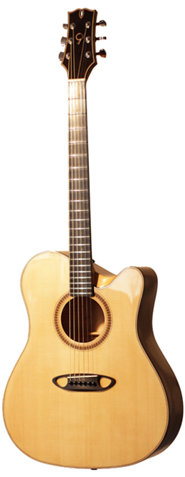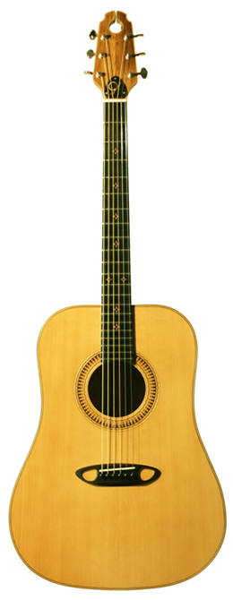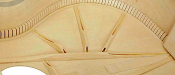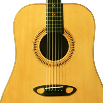 Le son de toutes ses folks est aérien, gras avec des basses bien profondes, des médiums boisés et des aigus brillants. Le moelleux du son est présent sur chacun des modèles. Ce qui est très appréciable dans les guitares d'Yves Ghirotto, c'est cette personnalité sonore dans un cadre très traditionnel. Le secret du son Ghirotto provient sans aucun doute du travail de son barrage qui, comme vous le voyez sur la photo si dessus est doublement allégé avec des barres scallopées et évidées. Ce qui doit également contribuer à cette forte personnalité sonore, c'est le choix des bois de tonalité avec du poirier, cerisier et noyer, il est clair qu'on sort un peu des traditionnels palissandre et acajou.