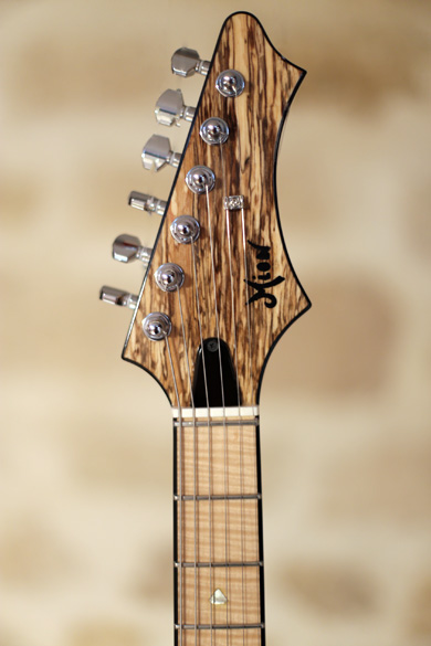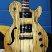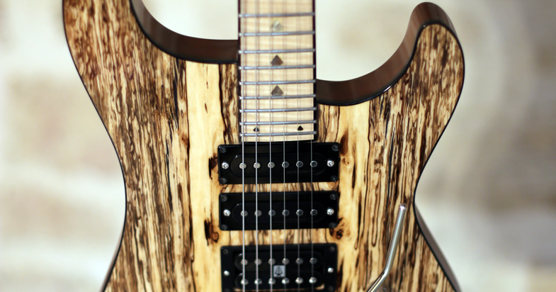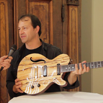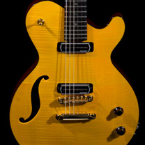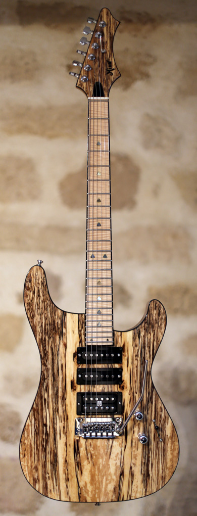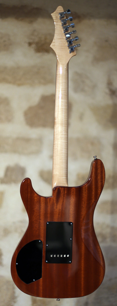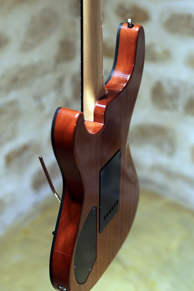 , une magnifique stradoïde avec un corps en acajou surmonté d'une sublime table en charme. Les 3 micros sont des Benedetti contrôlés pas un sélecteur 5 positions. Guitare faite pour le rock, je vous propose de visionner la démonstration de Julien Amiot, guitariste et ami d'Yves.