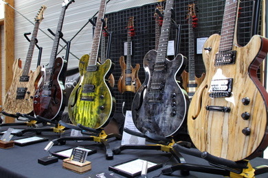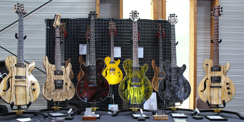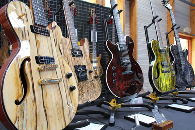 A chaque exposition où je croise les guitares d'Yves Mion, je reste en admiration devant les tables figurées de de ses modèles. Que ce soit du tilleul chenillé, du charme échauffé, de l'érable ondé ou du noyer, le bois est ici magnifié !