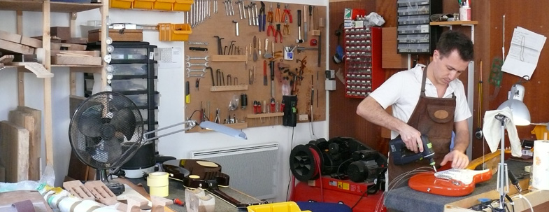 Au sujet de Pierre-Antoine Roiron : Pierre-Antoine Roiron est un luthier atypique. Après des études d’ingénieurs en mécanique réussies haut la main, il se passionne pour la lutherie, et l’étude des résonnances acoustiques. Très vite, après une première expérience professionnelle en tant qu’ingénieurs il décide de consacrer sa vie à sa passion : la conception de guitares et de basse. Depuis maintenant dix ans il crée et améliore ses modèles de guitares, et se spécialise dans les modèles dit « mouton à trois pattes », telles que les guitares baryton à 8 cordes par exemple, et il suffit de voir ses réalisations pour comprendre à quel point l’esprit de recherche des formes et de sonorité est au cœur de la passion de Pierre-Antoine. Allez faire un tour sur son site web, il vaut le détour ! : Coordonnées de Pierre-Antoine
