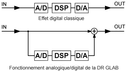 Selon G-Lab, la particularité de cette pédale « analogique-digitale » est « qu'elle vous propose le meilleur des deux mondes : numérique pour le traitement du signal (effet), et analogique pour la transmission du signal original (voir le schéma ci-dessous). »