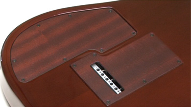 Les sillets de pont en acier inoxydable ont l’air très fiables et très conducteurs. Le vibrato, très sensible, de type strat moderne, est efficace également.