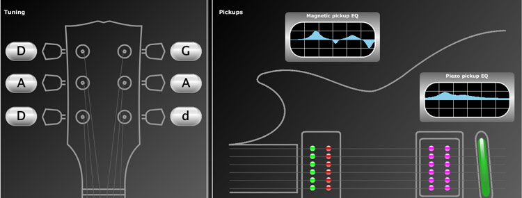 Enfin, pour finir, les 6 capteurs piezo sont placés un à un sous chaque pontet et sont réliés au boitier externe RIP. Ce dernier étant connecté à un ordinateur, vous avez alors toute la liberté d'action sur chacune des cordes. Vous pourrez voir dans la vidéo, Vincent Martinez s'amusant avec une disto sur les cordes de graves, un chorus sur le G et un delay et un flanger sur les autres cordes en son clair.