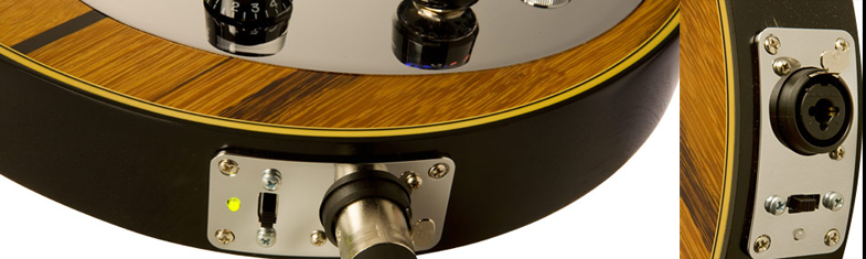 - Deux micros magnétiques : Burstbucker 3 (chevalet) et d’un P-90h (manche). Le "h", c'est pour l' aimant supplémentaire destiné à supprimer le bruit de fond inhérent au simple bobinage. Sous chaque pontet, Gibson a placé un capteur piezo. Donc 6 au total et là on commence à deviner pourquoi ! Le tout est connecté à un égalisateur 4 bandes programmable.
