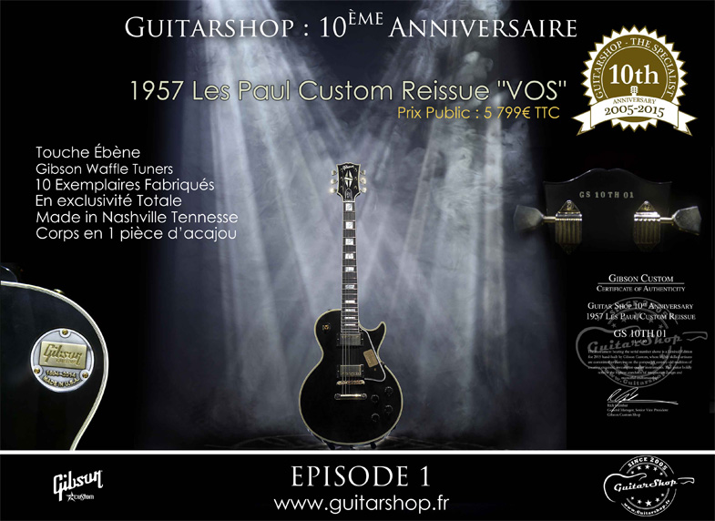 Pour ses 10 ans, Guitarshop est fier de vous présenter, en commande spéciale, cette 1957 Les Paul Custom Reissue en finition VOS, tirée seulement à 10 exemplaires, tous numérotés, accompagnés d'un certificat d'authenticité. À noter, la touche en ébène et les mécaniques Waffle !