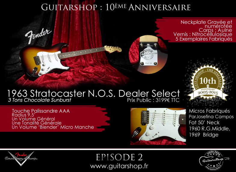 Pour ses 10 ans, Guitarshop est fier de vous présenter, en commande spéciale, cette 1963 Stratocaster Dealer Select en finition New Old Stock. Elle est tirée seulement à 5 exemplaires, avec plaque numérotée, accompagnée d'un certificat d'authenticité et d'un deuxième certificat expliquant la démarche autour de ce projet.