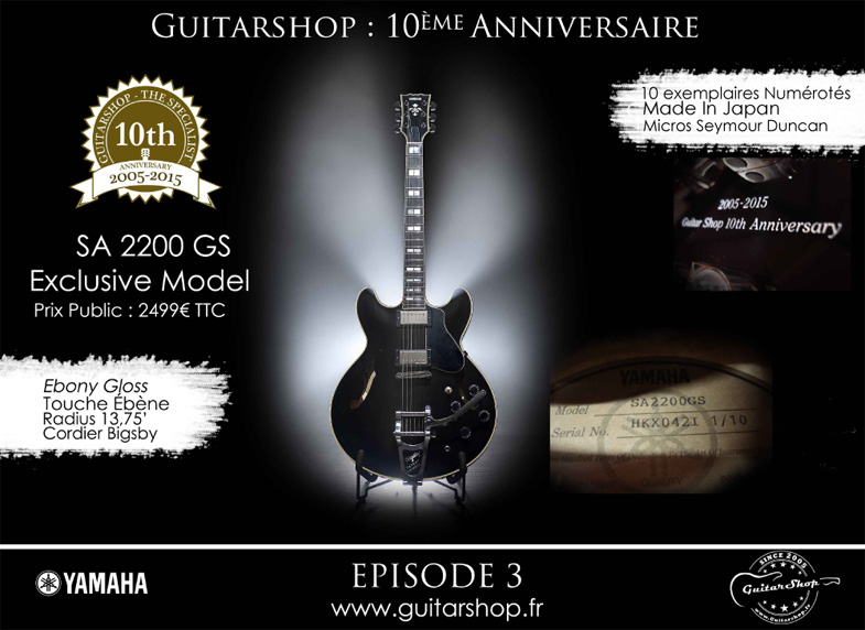 Pour ses 10 ans, Guitarshop est fier de vous présenter cette commande spéciale : la SA2200GS. Voici une SA2200 avec une finition jamais vue, noire avec Bigsby ! Tirée seulement à 10 exemplaires.