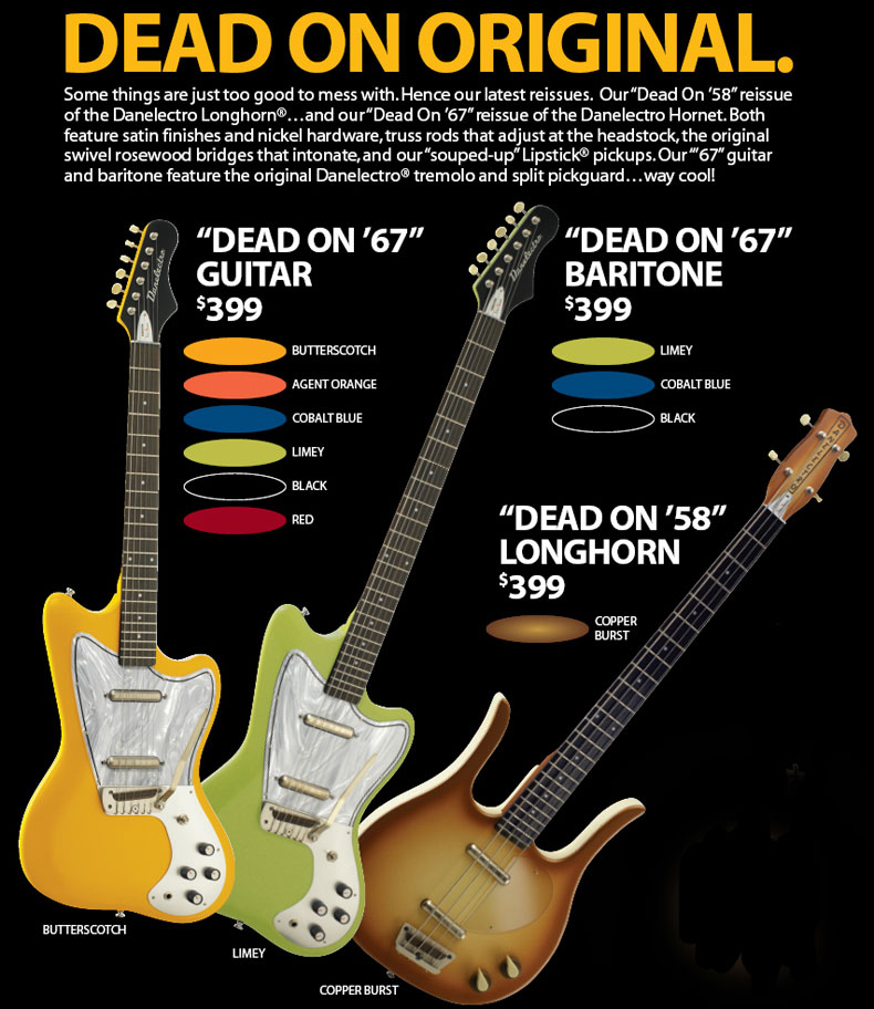 Pour tous les nostalgiques des années fin 60, voici une reissue des modèles Hornet avec la série Dead On '67 de chez Danelectro. Sa forme et ses couleurs aussi variées que flashy en feront craquer plus d'un. Surtout que le prix est complètement fou ! 300 euros pour la série Dead on '67, c'est pas dingue ça ?!
