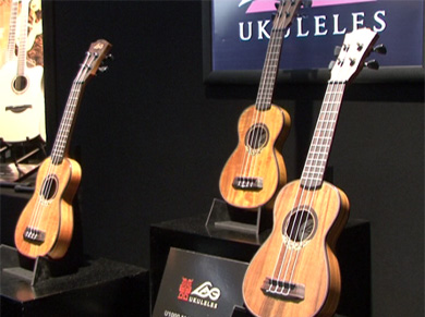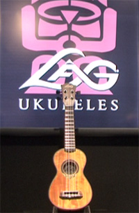 Au milieu des guitares électriques et acoustiques du stand Lag du musikmesse trônent trois ukuleles qui ne manquent pas d'attirer l'attention de notre lutheron Aël.