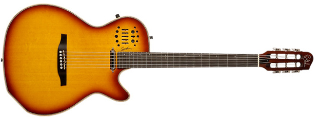 manche, une électronique Godin Custom avec réglages séparés de volume et de timbre du micro Lipstick, ainsi qu'un connecteur à 13 broches pour l'accès synthé et ordinateur.
