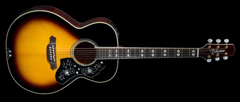 Le nouveau modèle Takamine édition limitée 2009 a l'allure d'une Gibson avec ce sunburst et cette plauqe de protection décorée. Il est équipé du préampli à lampes CTP-2 Cooltube.