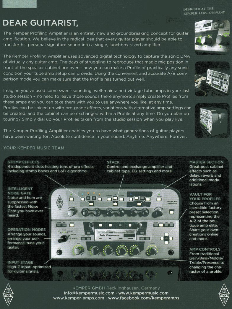 Une petite révolution dans le monde de l'amplification guitare et même si Two Notes avec son Torpdédo a déjà bien avancé dans ce domaine, voilà que la société Kemper présente son Profiling Amplifier, un ampli numérique qui vous permet de recopier l'empreinte de n'importe quel ampli et de restituer ensuite le son de celui ci.