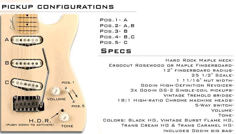 Inspirée de la légendaire Stratocaster, la Progression de chez Godin respecte les sonorités de celle-ci en proposant néanmoins plus de mordant et de dynamique dans le son grâce aux micros réalisés par les techniciens de chez Godin mais aussi au HDR, High Definition Revoicer.