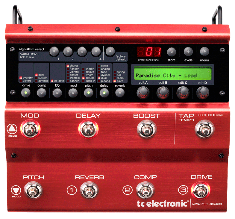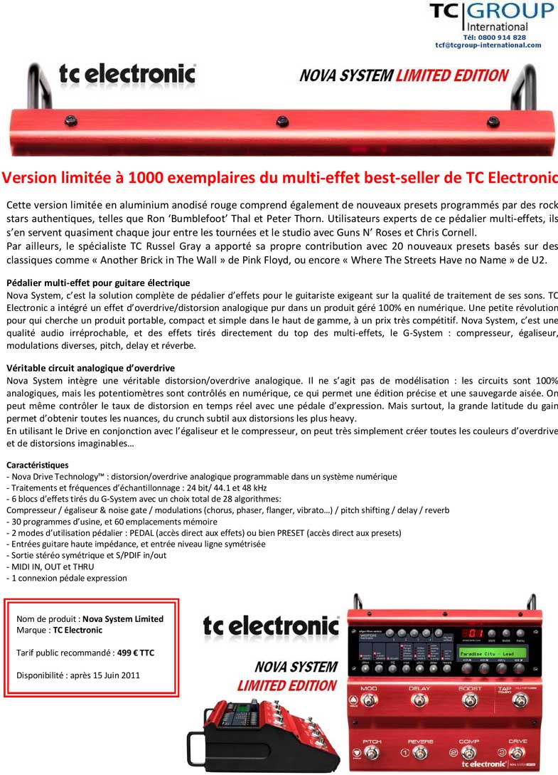 TC Electronic annonce une version en édition limitée du Nova System, pédalier multi-effet pour guitare électrique. D'abord une belle couleur rouge exclusive aux 1000 exemplaires qui seront mis en vente dans le monde. Ensuite, des presets uniques programmés par les artistes qui suivent la marque, comme Ron 'Bumblefoot' Thal et Peter Thorn (Guns N Roses et Chris Cornell), utilisateurs de Nova System de longue date. De plus, on pourra également trouver de nouveaux presets programmés par le démonstrateur Russel Gray, et reprenant précisément les sons de grands standards comme, par exemple, 'Another Brick In The Wall' de Pink Floyd ou encore 'Where the Streets Have No Name' de U2. Enfin, le nouveau firmware du Nova System apporte également plus d'une dizaine d'améliorations qui seront listées sur le site du fabricant. Le Nova System Edition Limitée sera disponible dans la seconde quinzaine de Juin au prix public conseillé de 499 € TTC.
