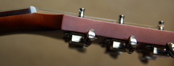 Le manche en érable est teinté avec un profil assez fin (46 mm au sillet de tête). La touche est en palissandre et la tête est réalisée à la façon "coupe en sifflet (voir vidéo). Cette technique permet de solidifier la tête. Le chevalet Tusq de Graptech est en palissandre et est bien sûr réglable.