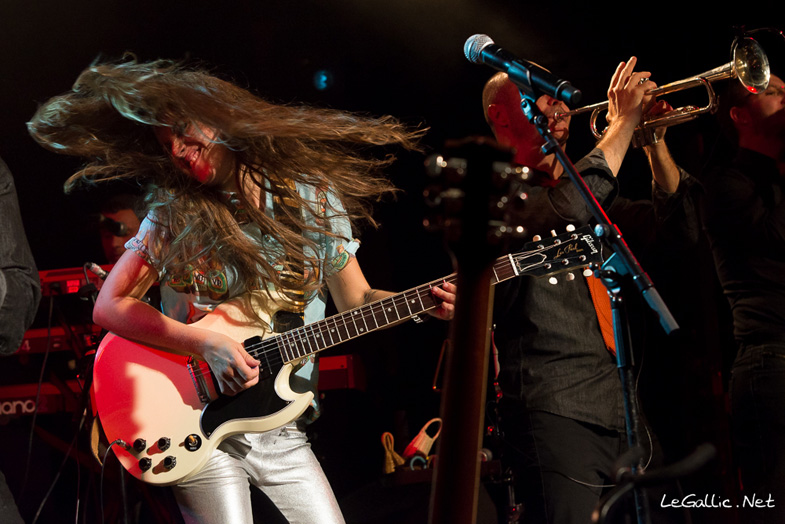 Elle nous délivre seule accompagnée de sa Gibson ES335 une reprise de “Freedom” extrait de la BO de “Django Unchained” de Tarantino et s’avance sans micro devant le public qui l’accompagne au chant. Elle s’offre une balade dans la salle tout en jouant un solo sur sa magnifique SG Gibson blanche, et une chose m’intrigue : pourquoi y-a-t-il “Les Paul Special” écrit sur la tête de cette guitare alors que c’est un corp de SG ?
