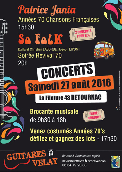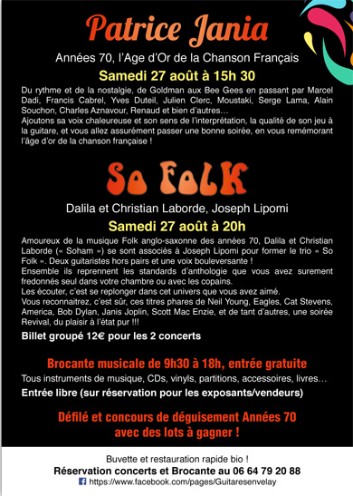 Pour les concerts, c'est Patrice Jania qui ouvrira les festivités, suivi de So Folk qui regroupe Dalila et Christian Laborde et Joseph Lipomi)
