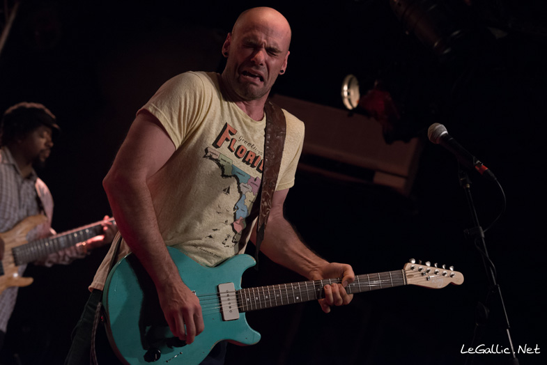 Il se lève ensuite pour prendre sa guitare signature fabriquée par le luthier Tom Marceau, entamme un solo, et suivent ensuite une série de larsens sur l'ampli sur lequel il est raccordé, et bien inspiré, il s'éloigne doucement de l'ampli pour traverser la salle, prendre un bain de foule et finir devant le bar, sauf que là surviennent des coupures du micro HF de son instrument ...