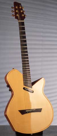 - Corps mince et évidé en acajou - Table en épicéa, barrage en X - Manche en acajou - Touche en ébène - Micro magnétique Benedetti - Capteur sous sillet et préampli - 2 sorties jack réglable - 2 volumes séparés - Toutes options sur demande