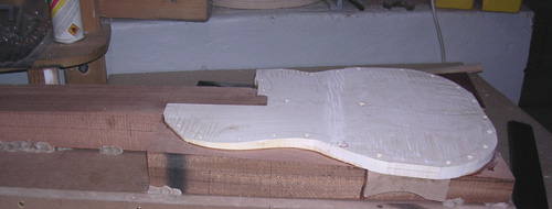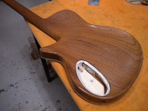 La plaque de la cavité arrière, en érable sculpté, comme l’arrière du corps, ne comporte aucune vis, son démontage se faisant côté table.