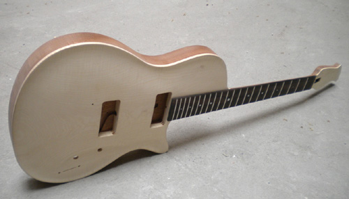Cette guitare ayant pour première source d’inspiration la Gibson Les Paul de 1954, elle dispose néanmoins d’une table rapportée en érable ondé d’une pièce que j’ai pris un malin plaisir à cacher sous une laque métallisée, d’où le nom de l’instrument.