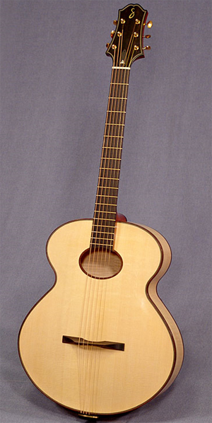 This model draws its inspiration from several schools of instrument making, especially classical guitar construction and violin theory and design. The application of Phi, or the divine proportion, that is found throughout nature and the universe has resulted in an instrument that is aesthetically pleasing, ergonomically correct, and acoustically brilliant. In addition to this combination, which is hard to improve on, it is also the most durable model and the least expensive, with prices starting at $4,927.00.