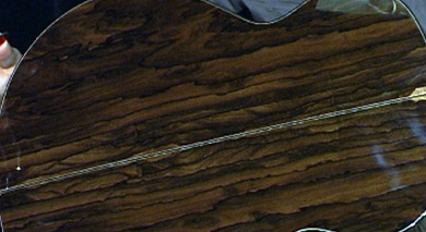 La lutherie est parfaite avec une table sublime parsemée de griffes d'ours, une rosace et une fileterie sobres qui laissent la place aux figures natruelles des essences. Le dos et les éclisses en Ziricote sont du plus bel effet.