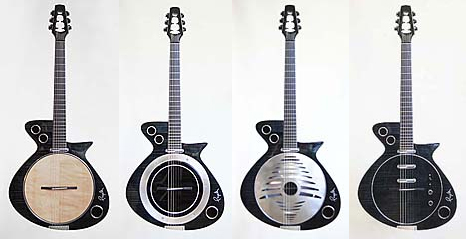 Cette année à la 5ème édition du salon de guitare de Montréal, Claudio a provoqué un gros buz avec son modèle convertible, un véritable instrument original qui méritait bien qu'on s'y attarde plus particulièrement. L'idée est simple mais néanmoins un véritable casse-tête pour un luthier : avoir quatre véritables instruments en un ! Un banjo, une guitare acoustique, une guitare à résonateur et une guitare électrique !