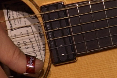 1 - Sur la première vidéo, un micro magnétique Benedetti simple bobinage flottant, au format mini-humbucker, avec plots réglables, que le luthier Christophe Grellier a installé sur mon modèle folk Summertime.