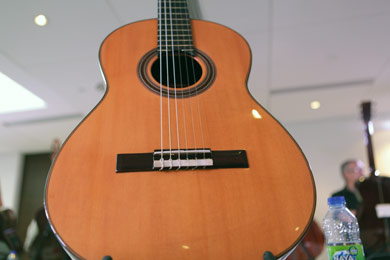 La table est en epicéa d'Italie (très légère), le fond et les éclisses sont en palissandre de rio (30 ans d'age) , manche en cedro , touche en ebène, chevalet en rio, les filets de bordure en ébène, la rosace " est faite maison" de type mosaique et de couleur lie de vin, les mecaniques sont des "rubner ". Les deux sillets sont en tusq et le vernis est un cellulosique.