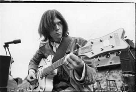 par terre, Neil Young n'a plus que 3 cordes à sa guitare...